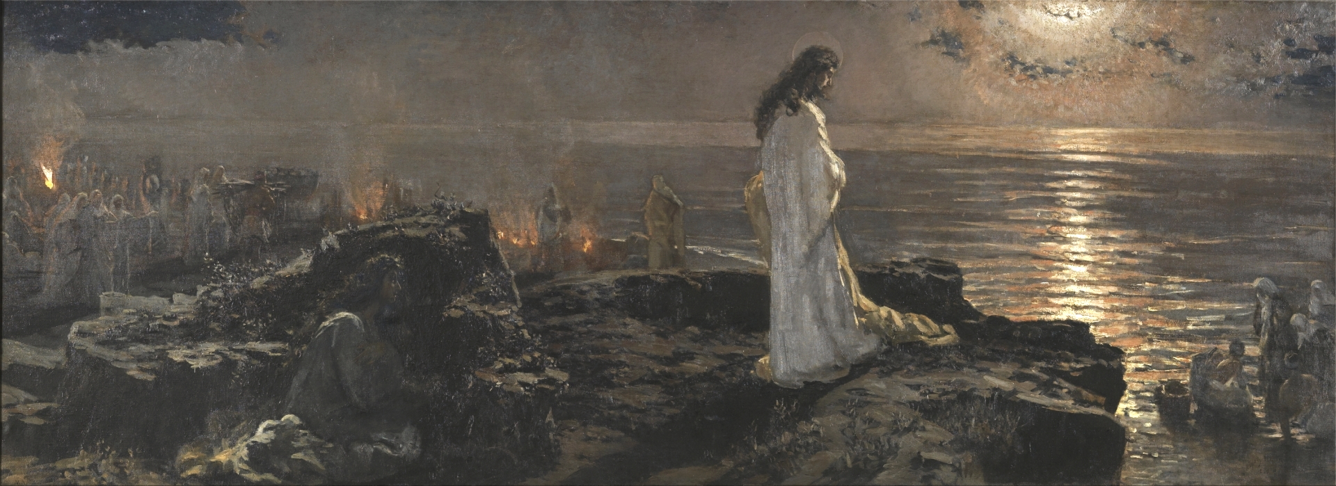 At that time, Jesus went over the Sea of Galilee which is that of Tiberias; and a great multitude followed Him, because they saw the miracles which He did on them that were diseased. Jesus therefore went up into a mountain, and there He sat with His disciples. Now the pasch, the festival day of the Jews, was near at hand. When Jesus therefore had lifted up His eyes, and seen that a very great multitude cometh to Him, He said to Philip, Whence shall we buy bread that these may eat? And this He said to try him; for He Himself knew what He would do. Philip answered Him, Two hundred penny-worth of bread is not sufficient for them, that every one may take a little. One of His disciples, Andrew, the brother of Simon Peter, saith to Him, There is a boy here that hath five barley loaves and two fishes; but what are these among so many? Then Jesus said: Make the men sit down. Now there was much grass in the place. The men therefore sat down, in number about five thousand. And Jesus took the loaves; and when He had given thanks, He distributed to them that were set down. In like manner also of the fishes, as much as they would. And when they were filled, He said to His disciples, Gather up the fragments that remain, lest they be lost. They gathered up therefore, and filled twelve baskets with the fragments of the five barley loaves, which remained over and above to them that had eaten. Now those men, when they had seen what a miracle Jesus had done, said, This is of a truth the prophet that is to come into the world. Jesus therefore, when He knew that they would come to take Him by force and make Him king, fled again into the mountain Himself alone.